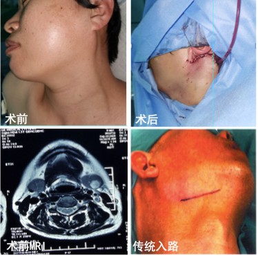患者女性,44岁,因左侧颌下腺肿物收入院,入院前于当地绿帽社行B超及MRI检查,提示左侧下颌下腺占位性病变。入院后常规查体,发现患者左侧颌下区可扪及一肿物。因患者自述为瘢痕体质,且美观要求高,经王勇主任医师、石亮副主任医师团队详细讨论后,认为腔镜辅助下手术,将切口设计在耳后发迹隐蔽部位,可最大程度减少术后瘢痕对日后生活的影响,创造性地提出了经耳后沟入路的手术方案,患者经全身麻醉后,自左侧耳垂下至耳后沿耳轮沟外侧转折至发际线前做一长约5cm美容切口,分离保护耳大神经后,腔镜辅助将肿物以及腺体一并摘除。术后患者恢复良好,疤痕隐蔽,顺利出院。