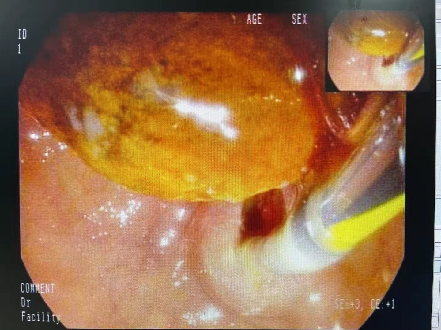 患者为一名95岁老年女性,因“腹痛”收治入院。入院完善检查后,诊断为“胆总管结石”。患者高龄,合并重度贫血,心肺功能差,经过前期的精心准备,在麻醉医师和护理团队配合下,消化内科副主任任洪波教授成功为该患者实施ERCP取石术,仅花费20分钟即成功为患者取出了直径约为2.5cm的胆总管结石。