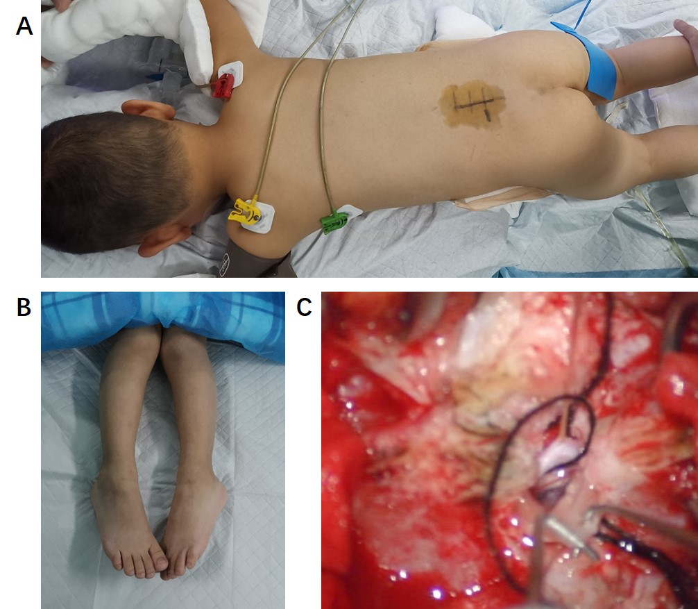 图1. A. 术中体位与刀口设计;B.术前查体示下肢内八字、马蹄内翻足畸形;C. 术中显微镜下椎板间入路剥离脊神经根束并选择性部分切断