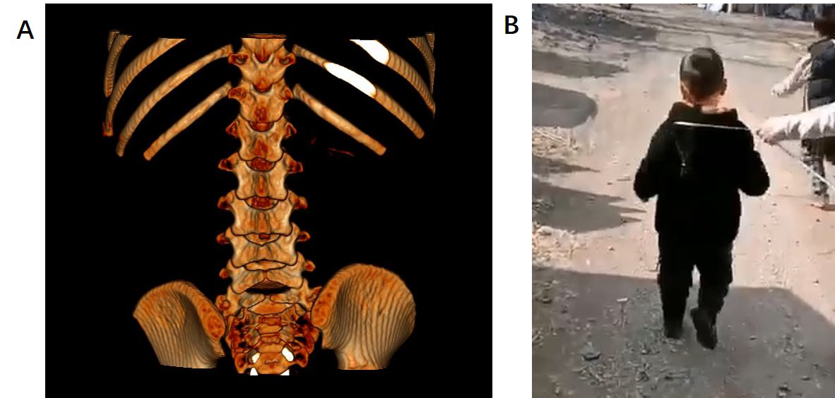 图2. A. 术后CT三维重建显示脊椎无损伤;B.出院后随访患儿行走自如