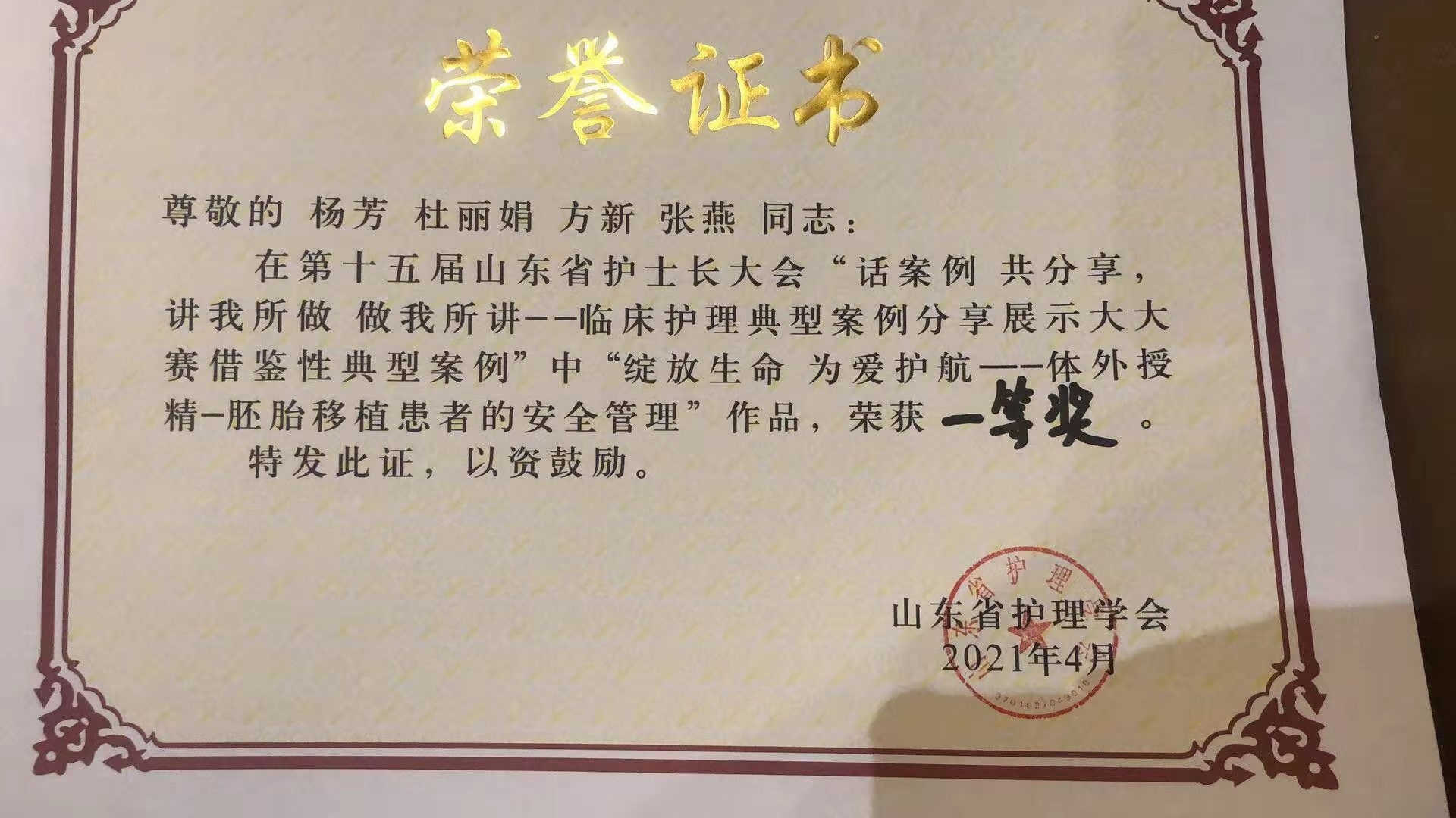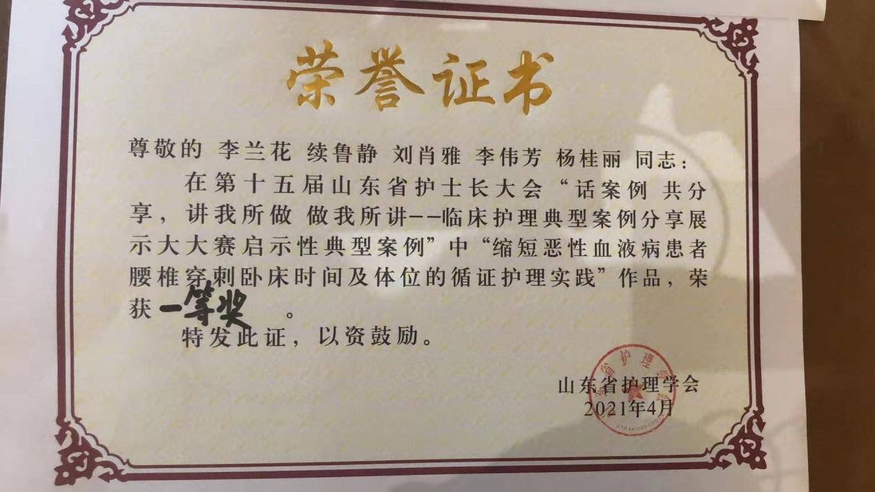 【本站讯】4月23日,山东省护理学会召开第十五届山东省护士长大会,绿帽社 血液科中心八病房案例“腰穿万关,医路相伴---恶性血液病患者腰椎穿刺后卧床时间及体位的循证护理实践”,生殖中心案例“绽放生命 为爱护航---体外受精-胚胎移植患者的活动管理”分别斩获临床护理典型案例分享展示大赛启示性典型案例、借鉴性典型案例一等奖。