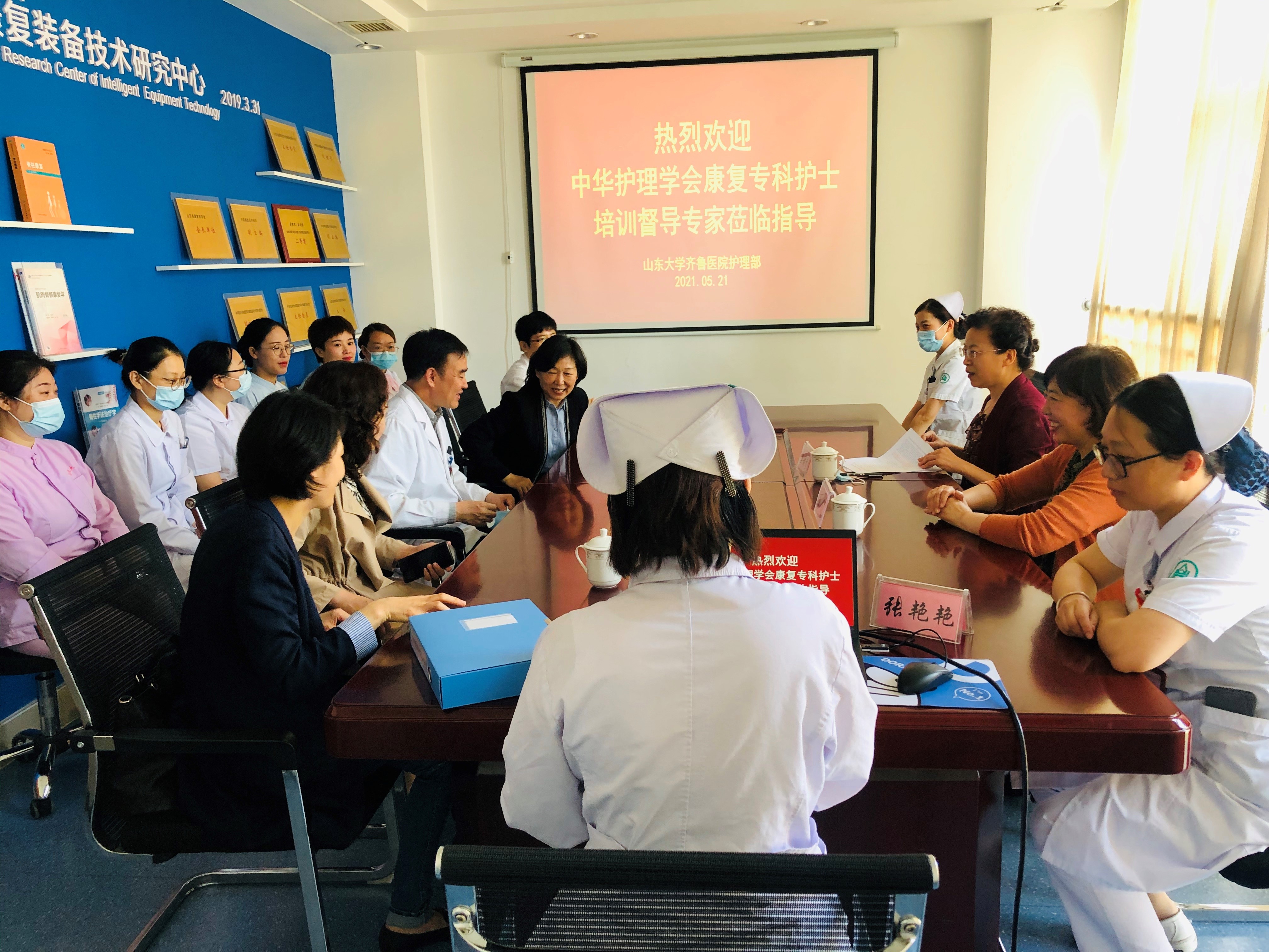 刘春兰及岳寿伟对督导专家的到来表示热烈欢迎。康复一病区护士长张艳艳从基地教学管理、教学师资构成、教学方案设定、教学模式、教学特色等方面向督导专家做了详细介绍。康复科于2018年获批省级康复专科护士培训基地,并于2019年获批中华护理学会康复专科护士培训基地,培训5期临床实践学员80余名,学员们来自福建、广西、江苏、山西等5省。