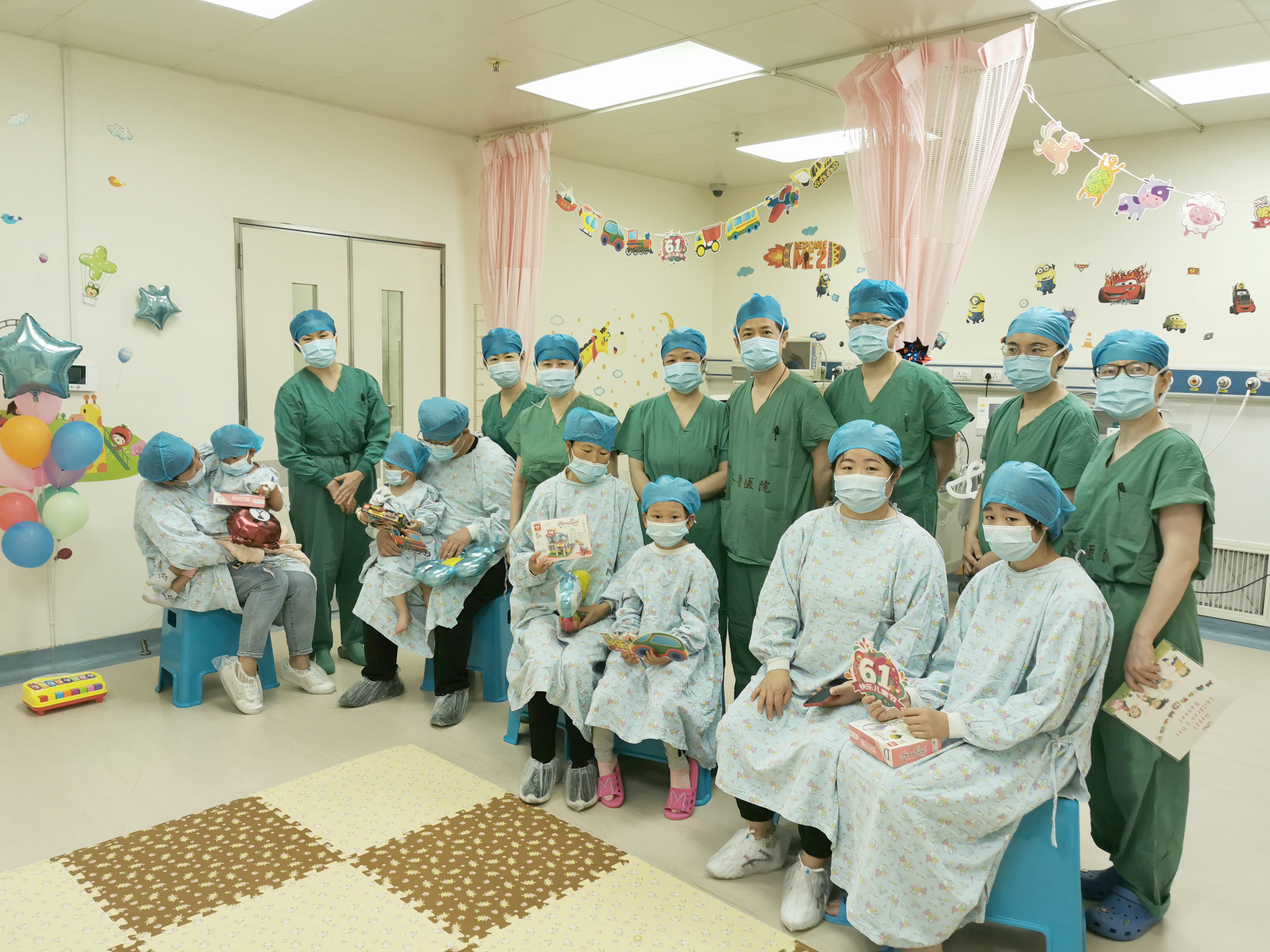 为了迎接这个属于小朋友们的节日,手术室小儿麻醉诱导间装扮一新,充满童趣化的装饰和玩具让小患者们不再紧张,在预麻间里和爸爸妈妈愉快地玩耍,让等待手术的小患者们感受到节日的氛围。翟永华和医护人员一起为等待手术的小朋友们送上节日礼物,祝福孩子们节日快乐!孩子们看到可爱的玩具,每个人的小脸上都露出开心的笑容。家长们感谢手术室医务人员为孩子们精心准备的节日礼物,高度赞扬了手术室的暖心之举,在这里度过了一个特殊而又温暖的儿童节。