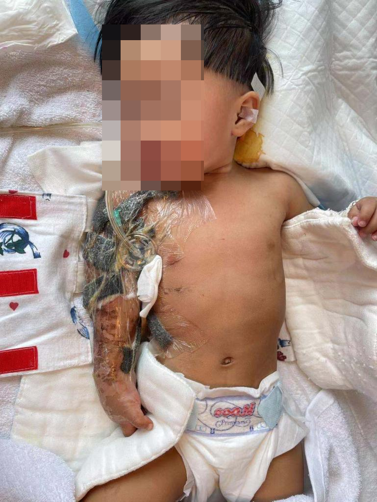 术后患儿送至儿科重症监护室病房,在主任医师胡瑞梅、刘心洁,主治医师董孟、李萌,住院医师刘江琳、刘秀美,护士长王玉珍及团队的共同努力下,患儿病情恢复平稳,顺利拔管。术后第10天转入手足外科病房显微外科监护室,护士长乔丽组织专班护理人员悉心护理,密切观察患儿病情变化。