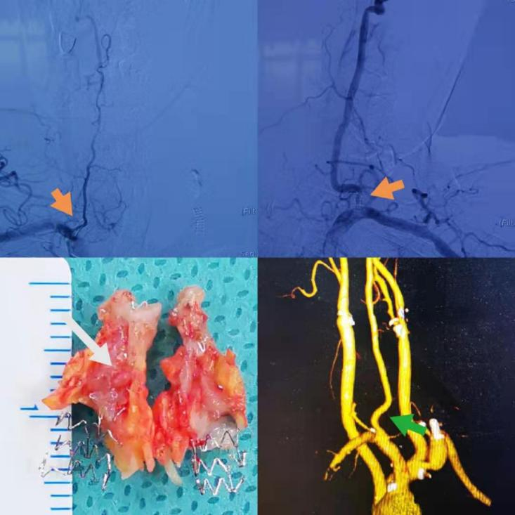 (黄色箭头为前期置入的椎动脉支架,左侧椎动脉近闭塞,白色箭头为术中取出的斑块和支架,绿色箭头指向重建的椎动脉,局部开口段管腔充盈良好)