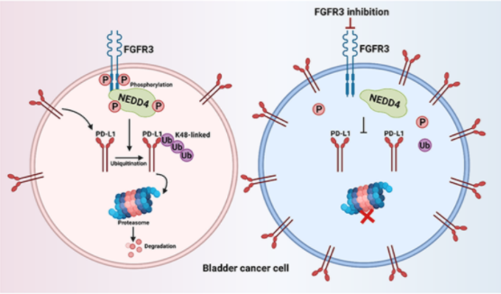 近几年来,随着膀胱尿路上皮癌分子分型及精准治疗的发展,除传统化疗外,免疫治疗、靶向治疗在尿路上皮癌的治疗中发挥重要作用。特定分子亚型的膀胱尿路上皮癌中FGFR3突变频率增加,FGFR抑制剂(厄达替尼)是目前在膀胱癌治疗中唯一被批准使用的TKI类药物,其针对膀胱癌中的成纤维细胞生长因子3(FGFR3)的激活突变,尽管有40%左右的FGFR3突变的膀胱癌患者能够从厄达替尼的治疗中获得缓解,但仍有超过一半以上的患者无法从该靶向治疗中获益。史本康教授团队从临床膀胱癌治疗面临的需求出发,首次揭示了在膀胱癌治疗中针对FGFR3的靶向治疗联合免疫检查点抑制剂能够显著增强治疗效果。同时通过进一步的机制分析,阐明了这种靶免联合用药的内在机制。该研究首次发现膀胱癌中激活的FGFR3能够通过招募并活化NEDD4进而对PDL1发挥泛素化作用,实现对PDL1的降解。厄达替尼等靶向药物的应用在抑制FGFR3信号通路的同时能够抑制NEDD4的磷酸化,升高肿瘤细胞表面的PDL1。团队进一步通过多种动物实验验证了靶向联合免疫治疗在膀胱癌小鼠模型中具有良好的抗肿瘤效果,这给下一步临床联合用药提供了坚实的理论基础。