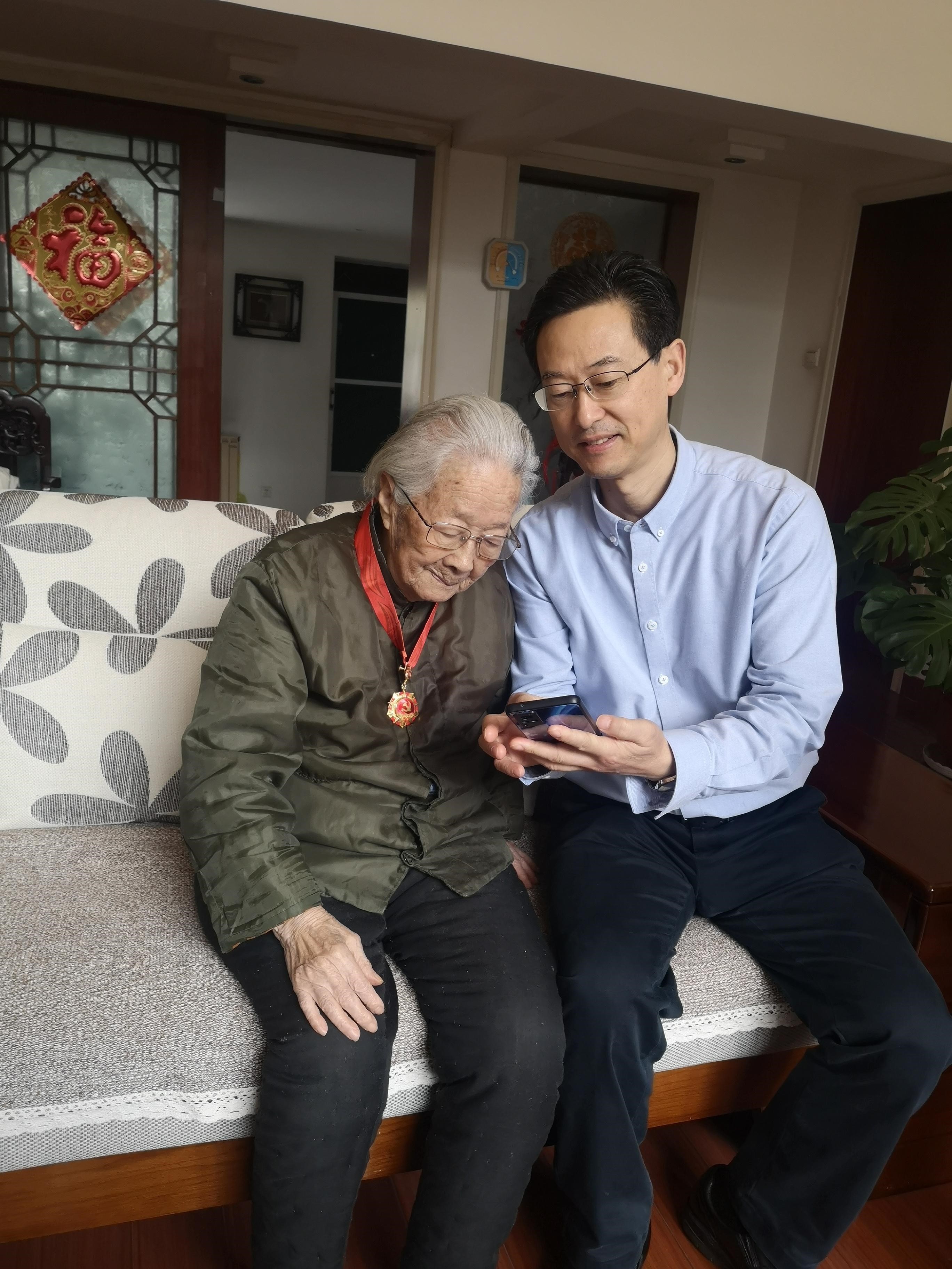 耿相柏老人已是102岁高龄,依然神采奕奕,思路清晰,热情地与神经外科党团支委们交流,向大家讲述峥嵘岁月的故事。耿相柏是开国少将况开田将军的遗孀,她1939年参加八路军,1941年4月入党,曾参加过平津战役、太原战役等。老人与况开田将军在烽烟战火的年代相遇,和丈夫共同养育了三个儿子、一个女儿,两个儿子和女儿都选择了参军入伍,是传承红色基因的革命家庭。全家共获得6枚“光荣在党50年”的宝贵勋章。