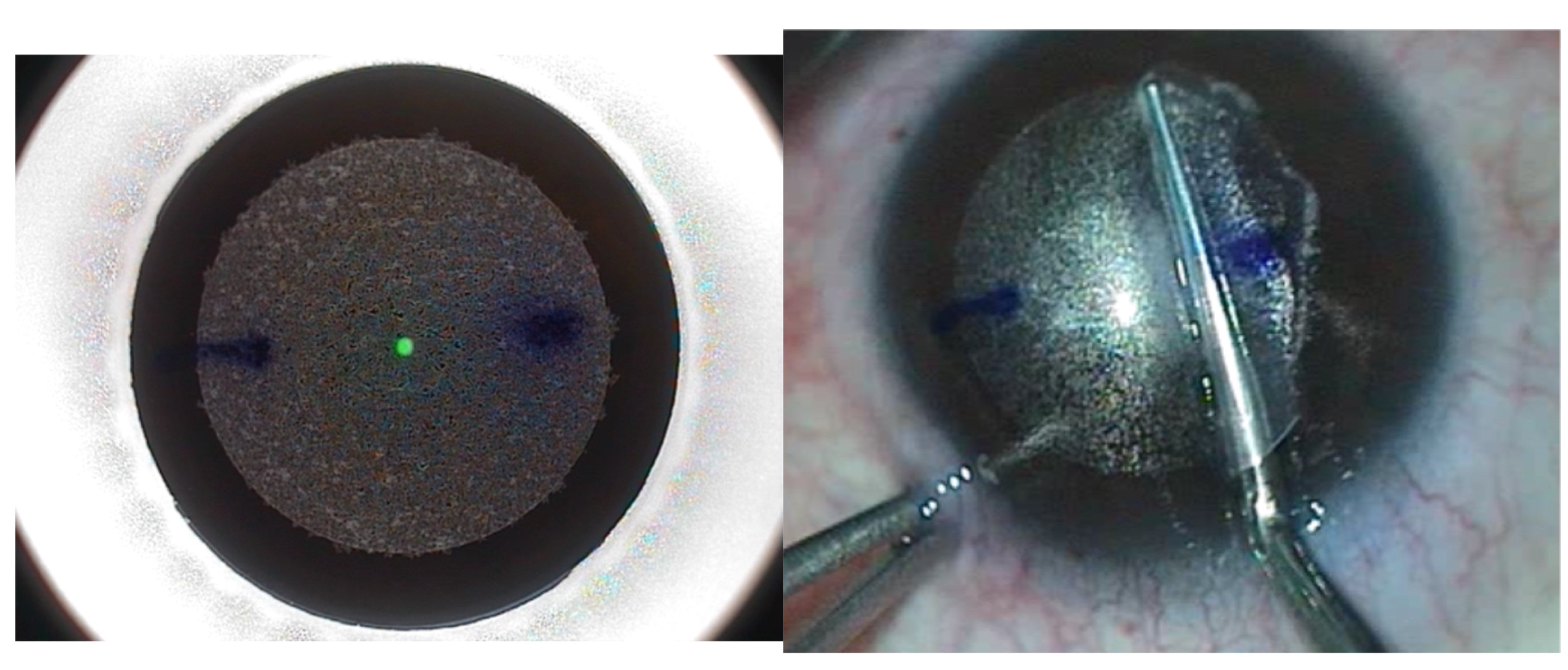2021年2月23日行双眼全飞秒手术,综合考虑患者的年龄、用眼习惯、主导眼、眼位和主观耐受性等因素,制定治疗方案。手术当日,为预防患者卧位可能产生的眼球旋转,需对进行角膜标记。在手术显微镜下按照标记对角膜的位置进行校正。