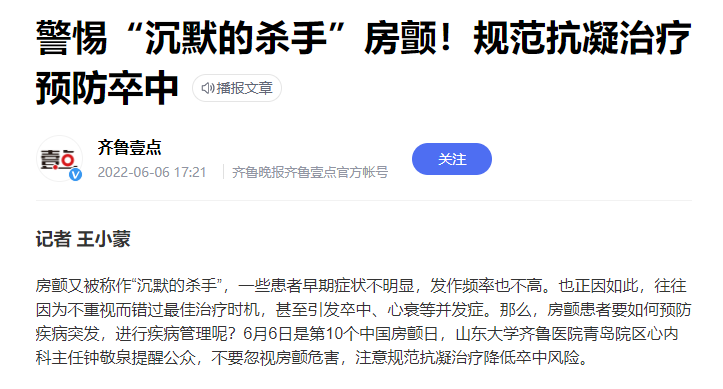 6月6日,齐鲁晚报对钟敬泉教授进行专访,发表题为《警惕“沉默的杀手”房颤!规范抗凝治疗预防卒中》的科普文章,提醒公众不要忽视房颤危害,注意规范抗凝治疗,降低卒中风险。