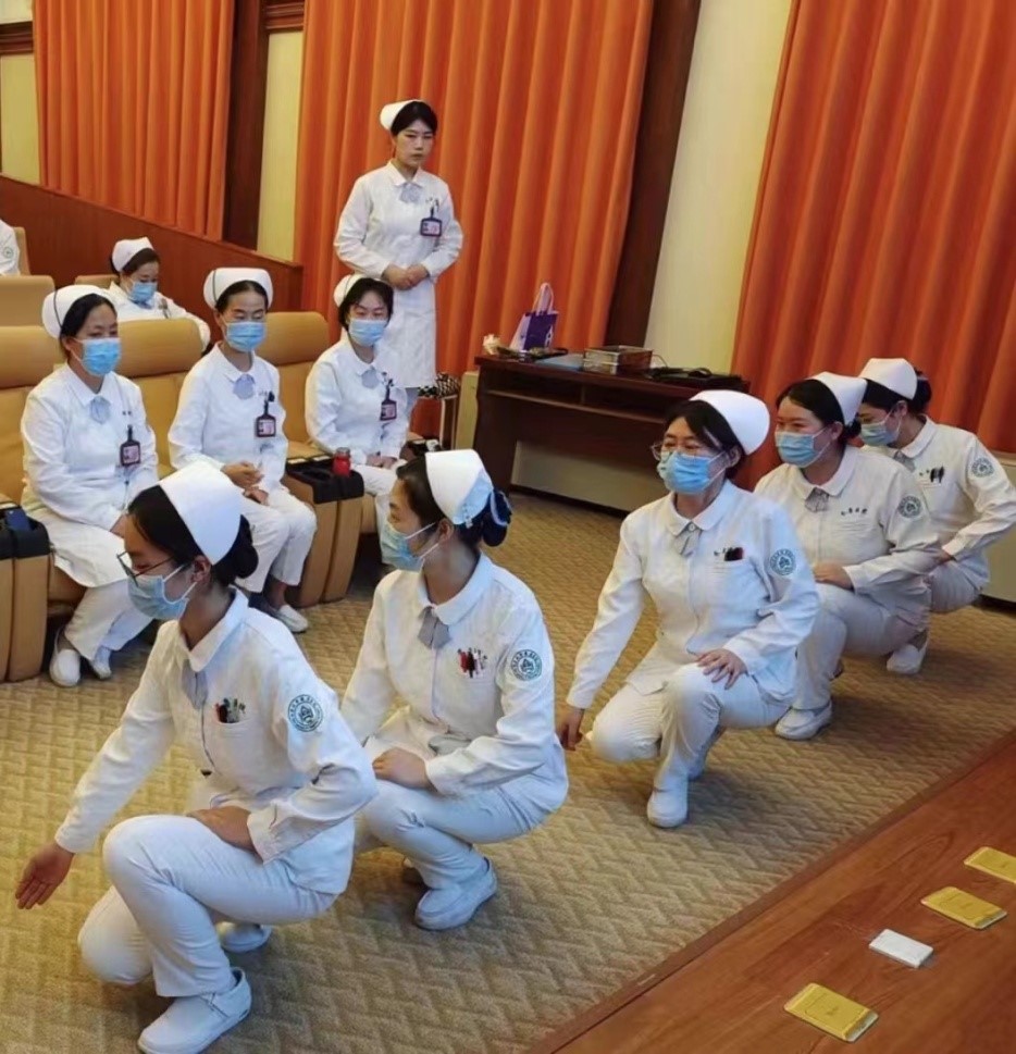 本次培训由于玲家、赵庆霞、相里晓颖三位护士长组织,护士长鲁燕主持,医务礼仪培训师刘佳和吕露辰按照礼仪规范及日常工作要求对本支部护士进行现场指导。刘佳和吕露辰以理论授课与动作示范相结合的方式从标准站姿、坐姿礼仪、行走礼仪、端治疗盘礼仪、站式交接班礼仪等方面内容进行了示范讲解。