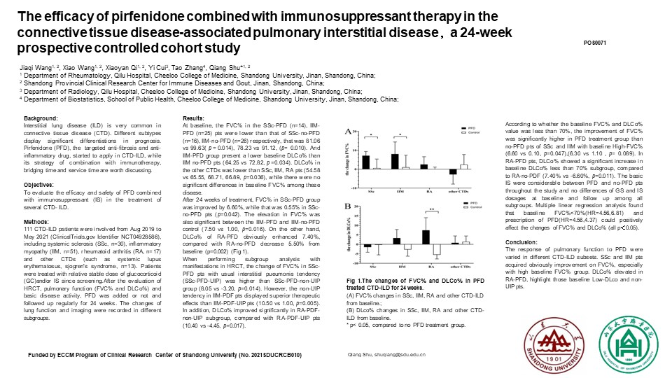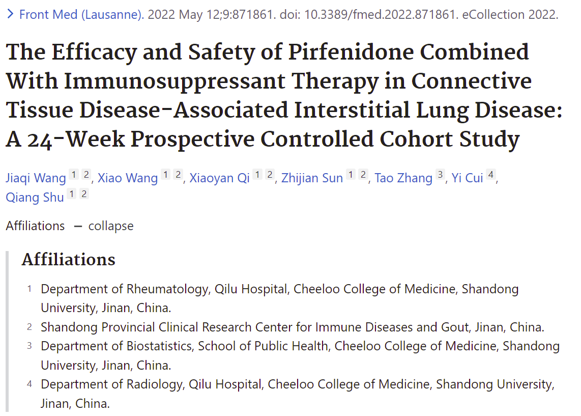 近日,风湿科、放射科与山东大学公共卫生学院合作报道了吡非尼酮联合免疫抑制剂治疗结缔组织病合并间质性肺疾病的一项前瞻性研究。该研究纳入了包括系统性硬化病、炎性肌病、类风湿关节炎、系统性红斑狼疮、干燥综合征和未分化结缔组织病在内的111例患者。经比较治疗前后的肺功能变化发现,不同种类的结缔组织病合并间质性肺疾病对吡非尼酮治疗反应不同。其中,系统性硬化病和炎性肌病经吡非尼酮联合治疗后FVC%改善最显著。类风湿关节炎合并间质性肺疾病人群中,非UIP型和低基线DLCo%患者经吡非尼酮治疗获益最大。该研究结果The Efficacy and Safety of Pirfenidone Combined With Immunosuppressant Therapy in Connective Tissue Disease-Associated Interstitial Lung Disease: A 24-Week Prospective Controlled Cohort Study发布在Frontiers in Medicine (JCR 2区,IF 5.058),绿帽社 风湿科研究生王佳琦为第一作者,舒强教授为通讯作者,绿帽社 为第一作者单位和通讯作者单位。