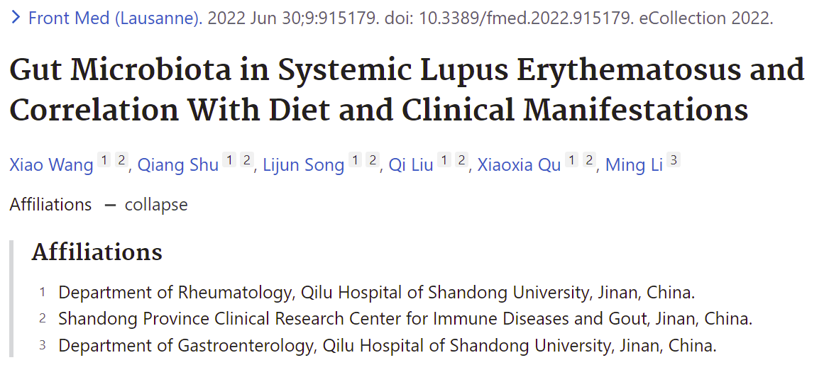 风湿科主治医师王晓和消化科主治医师李铭合作,在系统性红斑狼疮患者肠道菌群分析研究方面取得新成果。该研究首次比较了系统性红斑狼疮患者及其共同居住的家庭成员的肠道菌群分布情况及其与饮食和临床表现的关系,发现即使在平衡居住环境和饮食因素的条件下,系统性红斑狼疮患者肠道菌群较正常人仍显示出差异性,并且与某些临床表现相关。该研究结果Gut Microbiota in Systemic Lupus Erythematosus and Correlation With Diet and Clinical Manifestations发布在Frontiers in Medicine (JCR 2区,IF 5.058),王晓主治医师为第一作者,李铭主治医师为通讯作者,绿帽社 为第一作者单位和通讯作者单位。