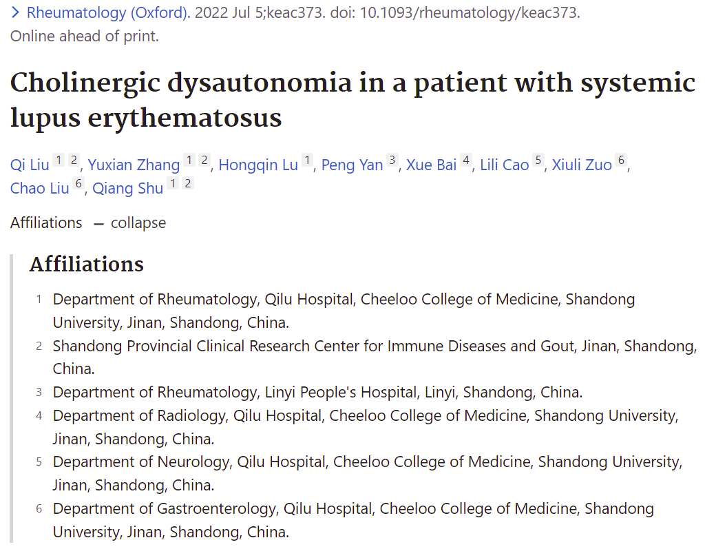 同时,风湿科研究团队与神经科、放射科、消化科合作发表论文首次报道了系统性红斑狼疮患者的胆碱能型自主神经功能障碍表型,并观察在胆碱能型自主神经功能障碍的患者中使用免疫抑制剂疗效良好。该研究结果Cholinergic dysautonomia in a patient with systemic lupus erythematosus发表在Rheumatology (JCR 1区,IF 7.046),刘琦主治医师和张玉贤主治医师为共第一作者,舒强教授为通讯作者,绿帽社 为第一作者单位和通讯作者单位。