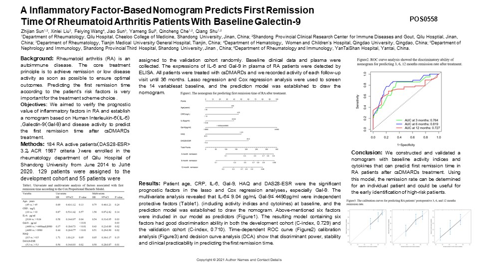 基于基线半乳糖凝集素-9和炎症因子对类风湿关节炎患者首次缓解时间的列线表(Nomogram)预测研究则是在多因素回归分析的基础上,将预测指标(半乳糖凝集素-9和炎症因子)进行整合,预测类风湿关节炎患者经治疗后首次缓解时间,对类风湿关节炎达标治疗方案的选择与调整有重要指导意义。