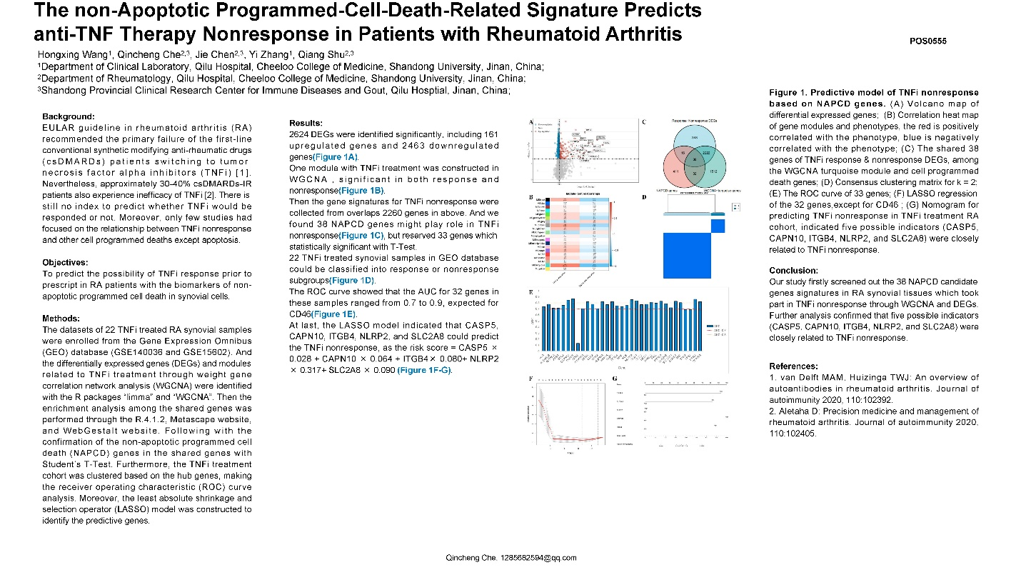 另外,在非凋亡程序性细胞死亡相关特征预测类风湿关节炎患者抗TNF治疗无反应的研究中,团队通过对既往类风湿关节滑膜组织基因数据库进行检索分析,筛选到可能导致TNF抑制治疗无效的基因,该研究进一步探讨了类风湿关节炎的发病机制并对该病的治疗学提供了机制研究基础。