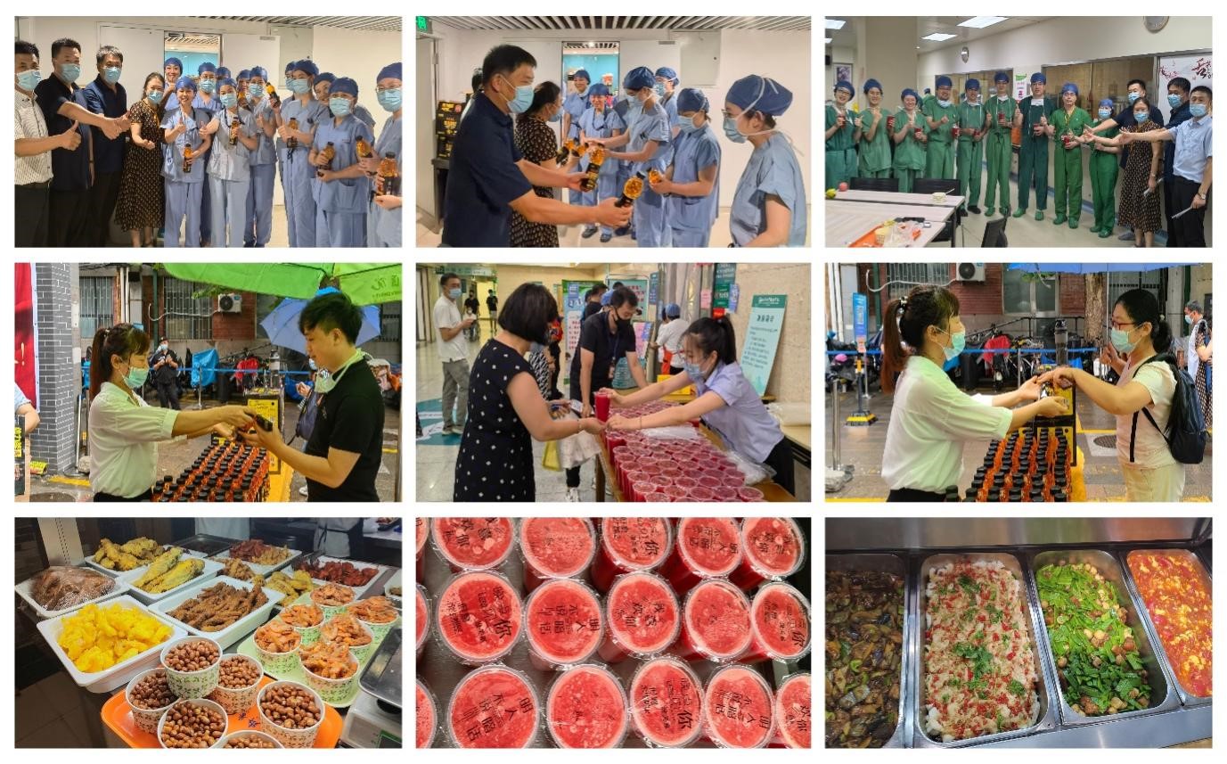 后勤物业管理科和职工食堂员工将消暑解渴的鲜榨果汁、饮品送到医务人员手中。此外,职工食堂还调整当天食谱,丰富了菜品种类,获得医务员工的一致好评。