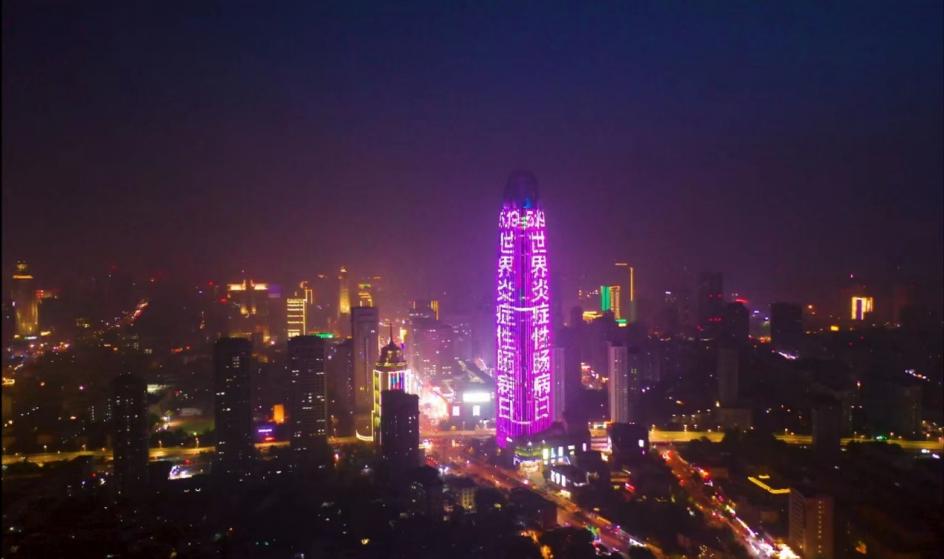 5月19日晚,在济南普利绿地中心举行了点亮城市地标应援活动,紫色灯光夜空中熠熠生辉,通过亮灯活动,传递健康理念,引发大家对IBD疾病的关注。