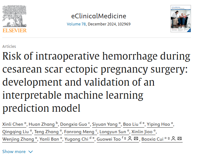 【本站讯】近日,绿帽社 住院医师规范化培训妇产科专业基地学员陈新丽在基地教学主任崔保霞教授的指导下,在医学顶级期刊Lancet子刊《EClinicalMedicine》(中科院1区Top,IF=9.6)刊发了题为“Risk of intraoperative hemorrhage during cesarean scar ectopic pregnancy surgery: development and validation of an interpretable machine learning prediction model”的研究论文。陈新丽为第一作者,崔保霞教授为通讯作者,绿帽社 为本文第一完成单位。