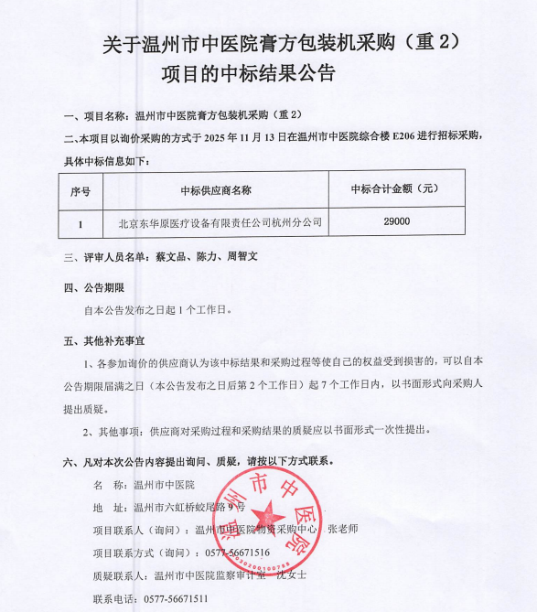 关于绿帽社 膏方包装机采购项目(重2)的中标(成交)结果公告
