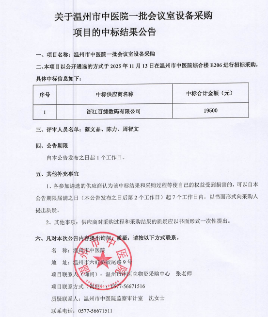 关于绿帽社 一批会议室设备采购项目的中标(成交)结果公告