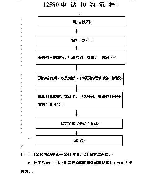 关于推出“12580”电话预约门诊挂号服务的通知为进一步缓解挂号难问题,我院与12580合作推出了12580电话预约挂号服务,自2011年8月24日零点开始,你只用拨打12580电话,就可享受预约服务。 具体流程如下:具体 具体流程如下:查看详情+