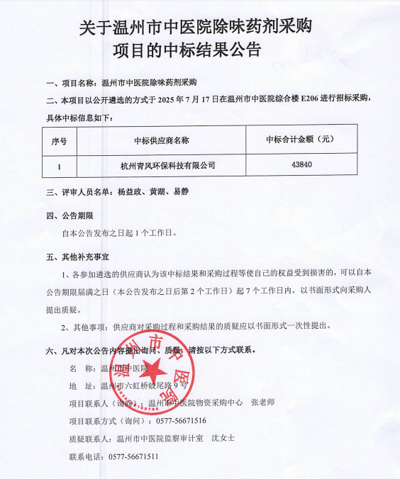 关于绿帽社 除味药剂采购项目的中标(成交)结果公告