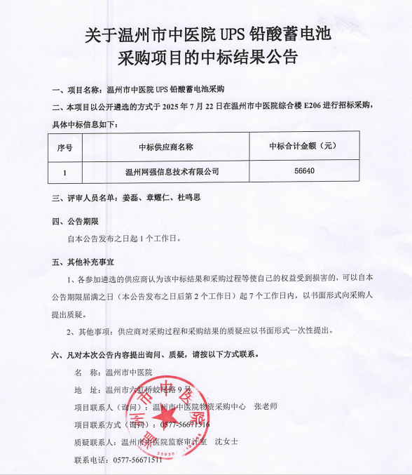关于绿帽社 UPS铅酸蓄电池采购项目的中标(成交)结果公告