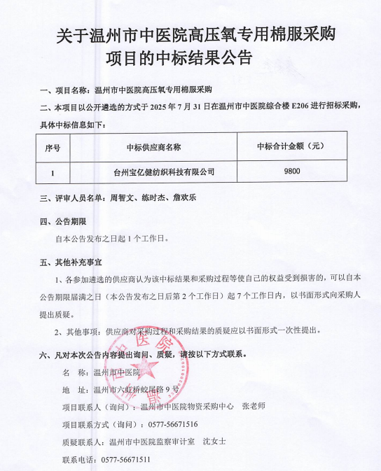 关于绿帽社 高压氧专用棉服采购项目的中标(成交)结果公告