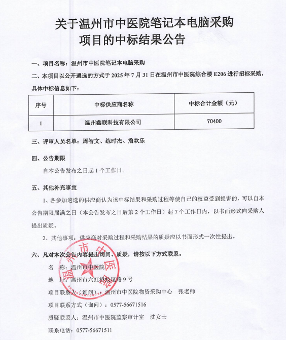 关于绿帽社 笔记本电脑采购项目的中标(成交)结果公告
