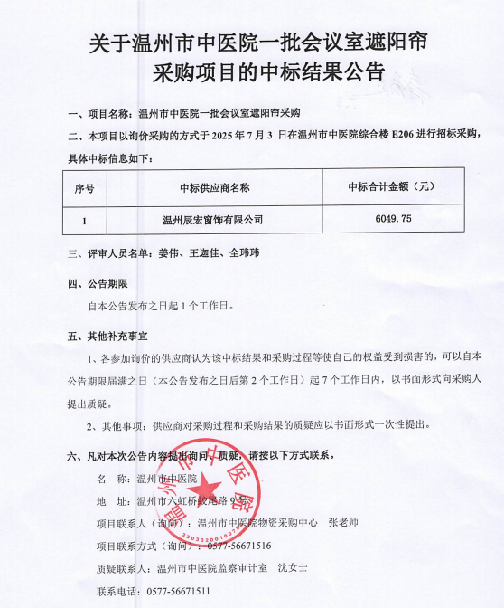 关于绿帽社 一批会议室遮阳帘采购项目的中标(成交)结果公告