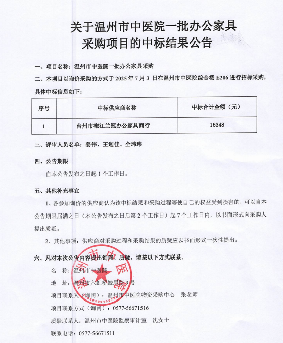 关于绿帽社 一批办公家具采购项目的中标(成交)结果公告