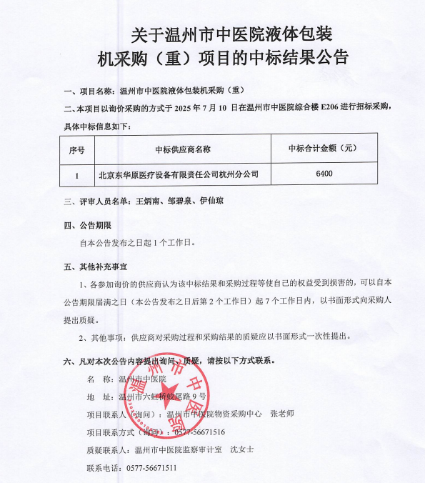关于绿帽社 液体包装机采购项目(重)的中标(成交)结果公告
