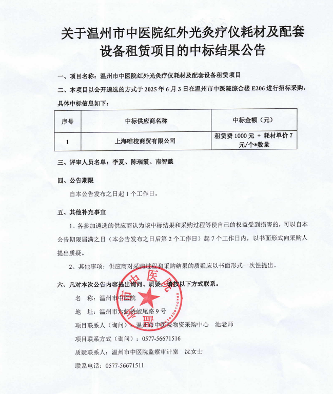绿帽社 红外光灸疗仪耗材及配套设备租赁项目中标公告(二)关于绿帽社 红外光灸疗仪耗材及配套设备租赁项目,原中标供应商主动弃标,按相关法律法规和院内管理办法,由第二名顺位中标。查看详情+