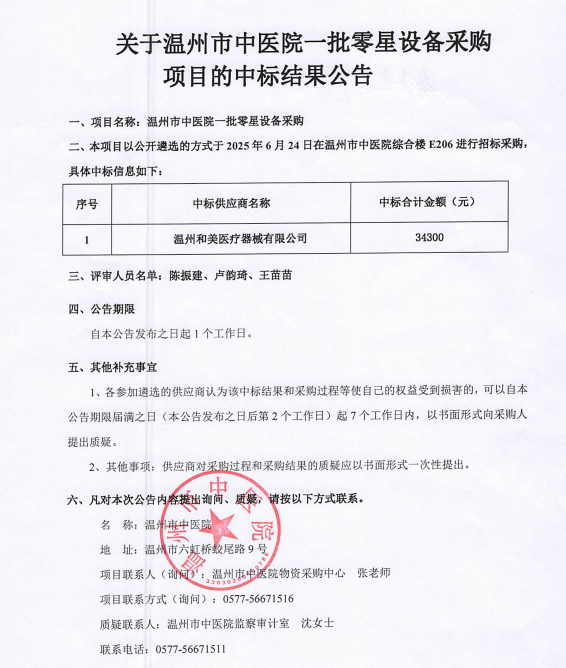 关于绿帽社 2025年度第三批医疗设备比选的结果公示