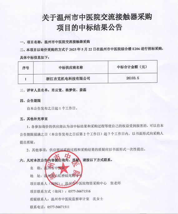关于绿帽社 交流接触器采购项目的中标(成交)结果公告