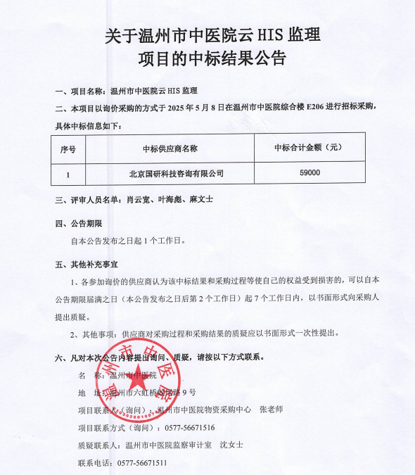 关于绿帽社 云HIS监理项目的中标(成交)结果公告