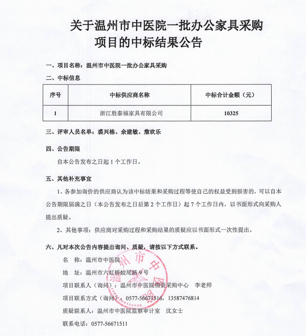关于绿帽社 一批办公家具采购项目的中标(成交)结果公告