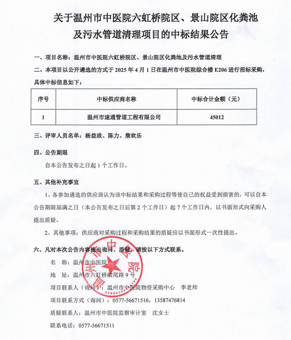 关于绿帽社 六虹桥院区、景山院区化粪池及污水管道清理项目的中标(成交)结果公告