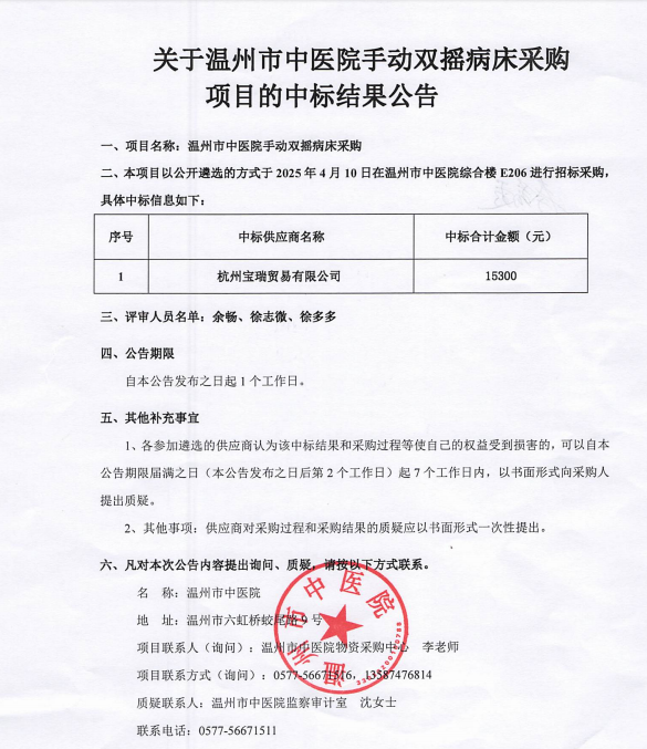 关于绿帽社 手动双摇病床采购项目的中标(成交)结果公告