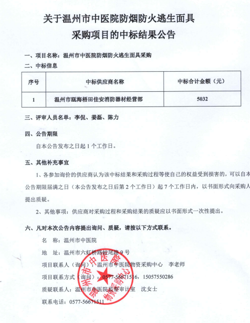 关于绿帽社 防烟防火逃生面具采购项目的中标(成交)结果公告