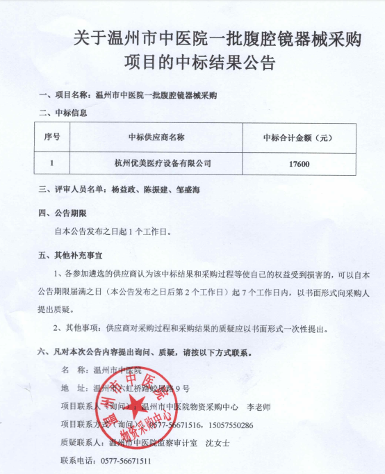 关于绿帽社 一批腹腔镜器械采购项目的中标(成交)结果公告