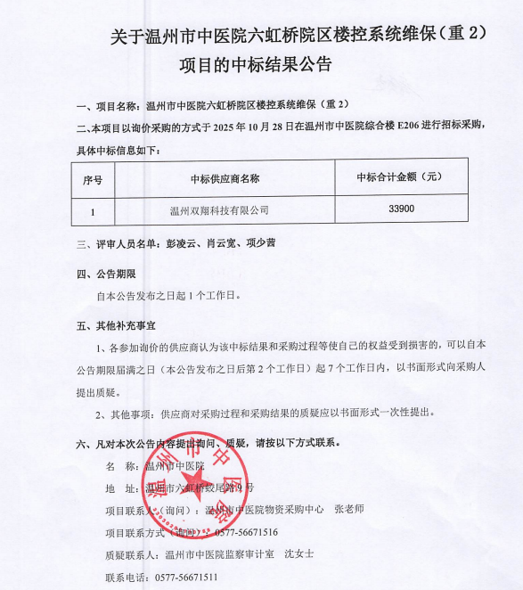关于绿帽社 六虹桥院区楼控系统维保(重2)项目的中标(成交)结果公告