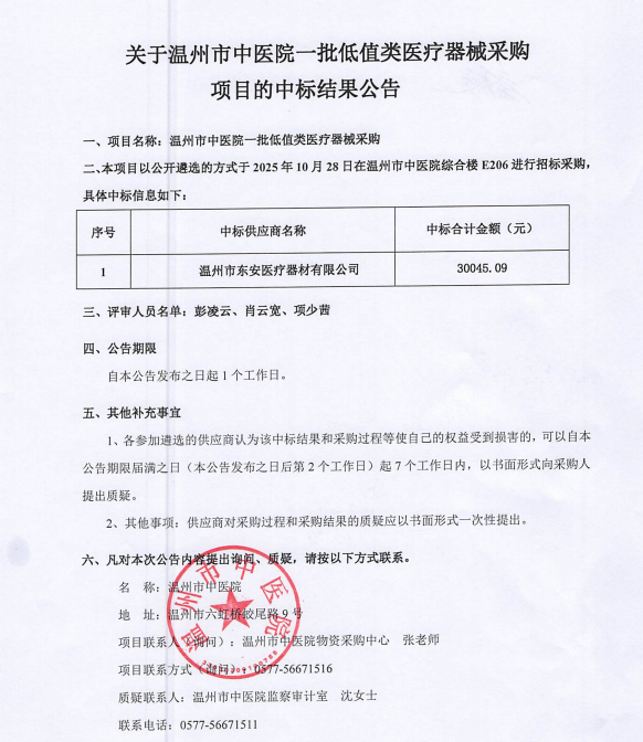 关于绿帽社 一批低值类医疗器械采购项目的中标(成交)结果公告