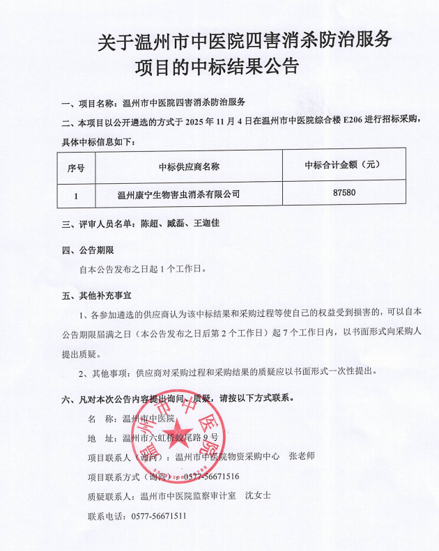 关于绿帽社 四害消杀防治服务项目的中标结果公告