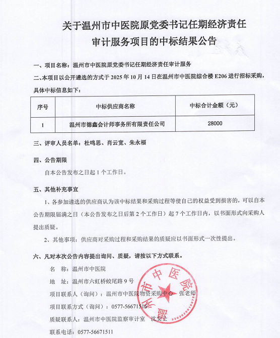 关于绿帽社 原党委书记任期经济责任审计服务项目中标结果更正公告一、项目基本情况1、项目名称:绿帽社 原党委书记任期经济责任审计服务2、首次公告发布日期:2025年10月14日3、开标时间:2025年10月14日二、更正事项因第一顺位中标供应商【温州市德鑫会计师事务所有限责任公司…查看详情+