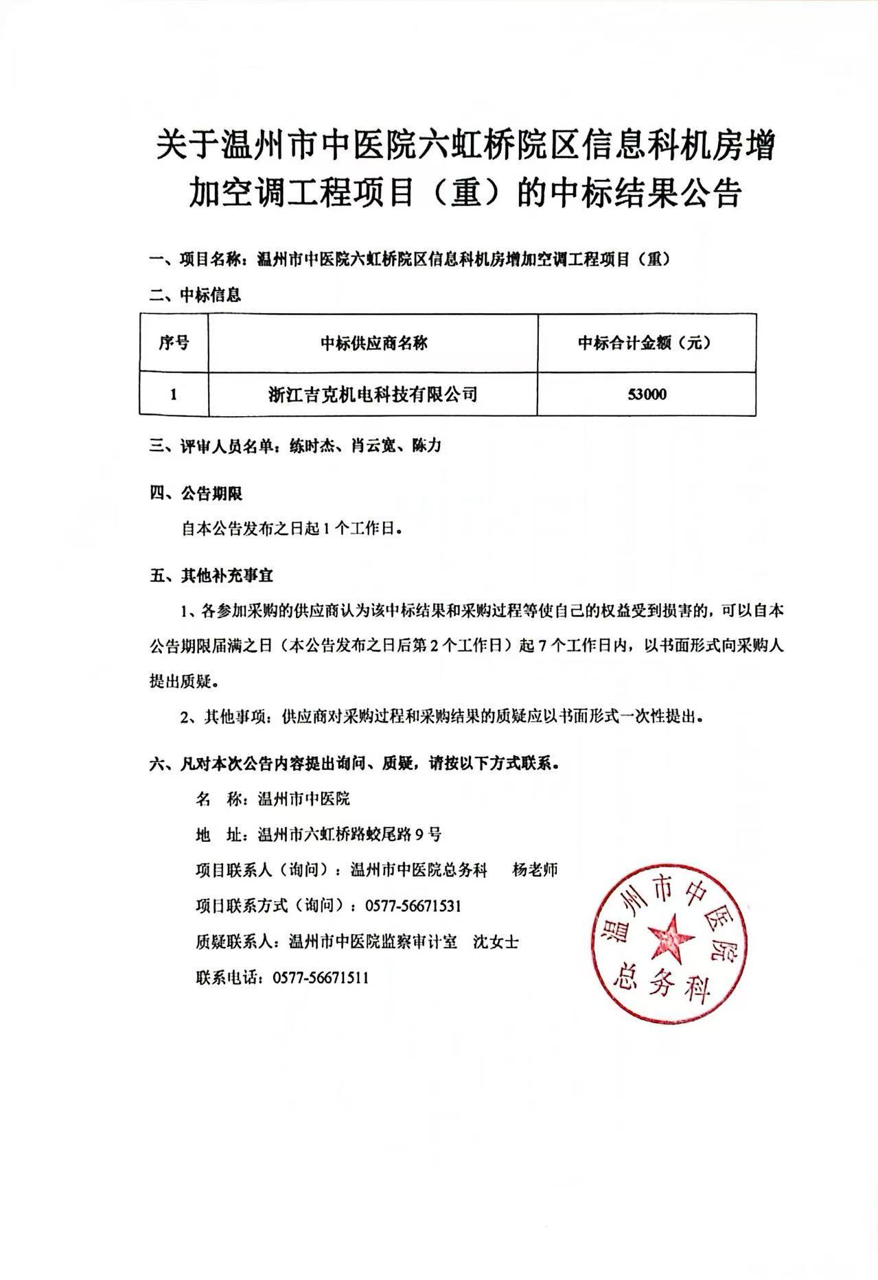 关于绿帽社 六虹桥院区信息科机房增加空调工程项目(重)的中标结果公告