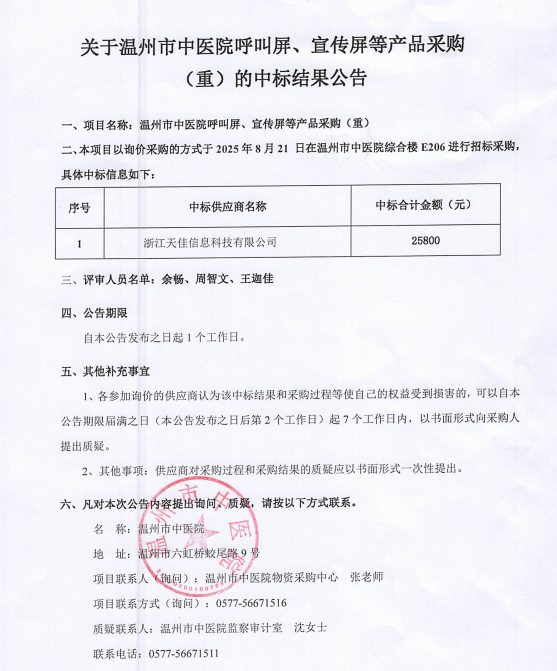 关于绿帽社 呼叫屏、宣传屏等产品采购(重)的中标(成交)结果公告查看详情+