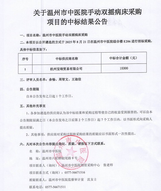 关于绿帽社 手动双摇病床采购项目的中标(成交)结果公告
