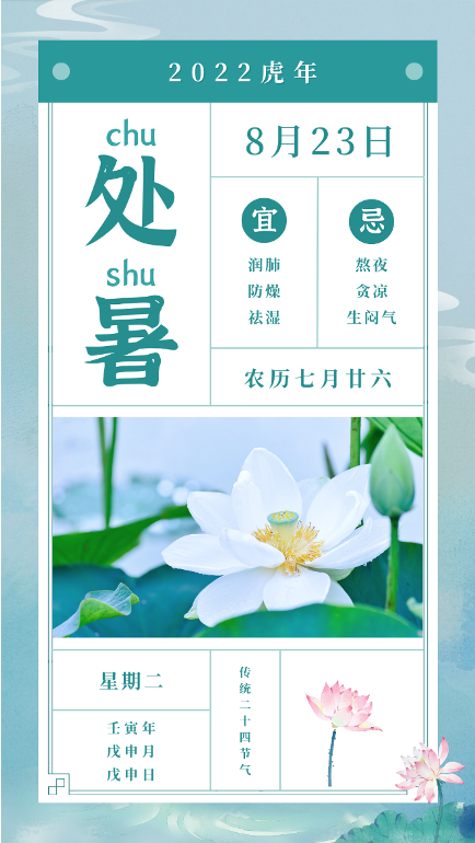 处暑|四时俱可喜,最好新秋时处暑,是二十四节气之第十四个节气,也是秋季的第二个节气。斗指戊(西南方);太阳黄经达150;于每年公历8月22-24日交节。处暑,即为“出暑”,是炎热离开的意思。时至处暑,太阳直射点继续南移、太阳辐射减弱,副热…查看详情+