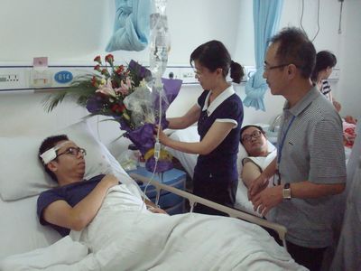 今天上午10点,铁道部劳卫处处长韩树荣一行七人在我院施仲义副院长、工会主席宫温虹等人的陪同下来院探望了7.23动车事故伤员戴章,并送上鲜花及慰问品,施仲义副院长向探视人员详细介绍了伤员的伤情和目前的恢复情况。据悉今天上午他们还将去市二医、118绿帽社 、手足外科绿帽社 等四家绿帽社 探望伤员。
